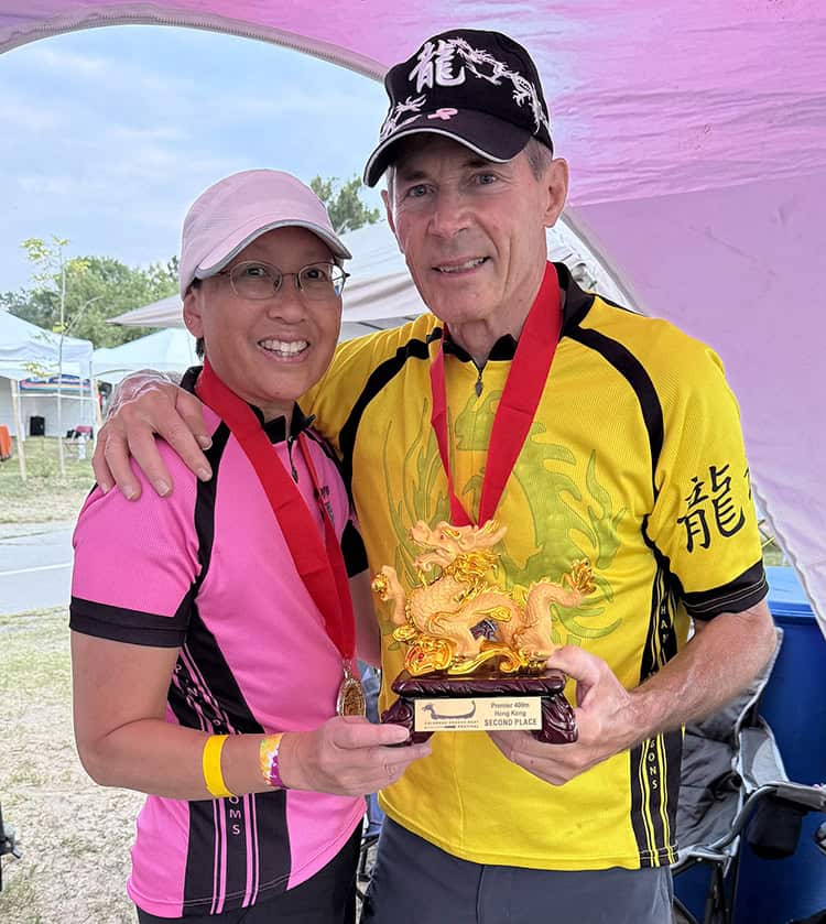 Alice’s husband, Dick, began racing in 2019. It was a great way for he and Alice to travel and race together. They have both raced and received medals at the U.S. Club Crew National Championships and they have both raced in the International Dragon Boat Festival. Alice received a bronze medal at the festival in Ravenna, Italy in 2024 with a team of cancer survivors.